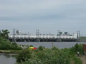 Řeka je zadržena hrází o celkové délce 2 685 m. Betonová hráz byla vybudována v unikátní kombinaci s tělesem budovy elektrárny o délce 386 m se schopností přelivu do výše 21 000 m³/s.