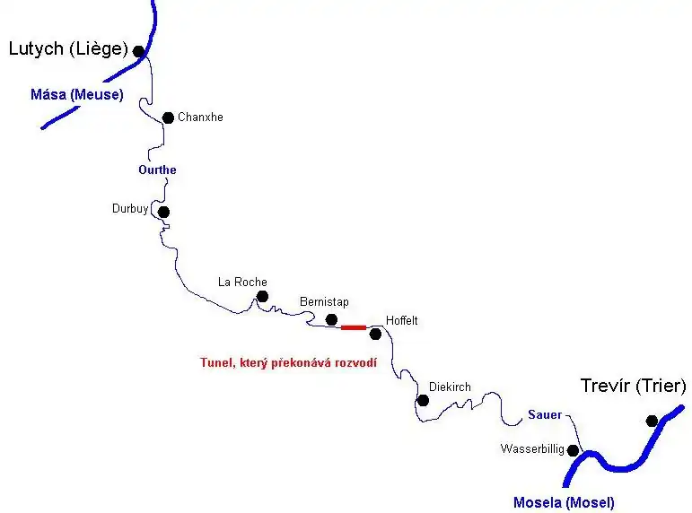 Od Angleur u Lutychu vede trasa průplavu po řece Ourthe přes Durbuy, La Roche a Houffalize. Mezi Hony a Esneux byla plánována zkratka tunelem.