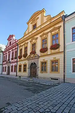Dům vznikl spojením dvou původně renesančních domů. Kolem roku 1720 byl objekt barokně přestavěn, včetně barokní úpravy fasády. Dům je mírně předsazen do ulice (cca 40 cm), je patrový a stavební dispozice domu má tři trakty. Celkový půdorys domu je ve tvaru lichoběžníku. Středový trakt přízemí tvoří průchozí chodba halového typu, zaklenutá v předním a zadním poli křížovou klenbou. Ze středního pole je nástup do prvního patra po jednoramenném vřetenovém schodišti, zaklenutém valenou klenbou, na podestách jsou vysoké niky. Boční trakty tvoří obytné místnosti zaklenuté křížovou klenbou. Přední místnost levého traktu má navíc čtyři lunety. V patře je vedle obytných místností zasedací místnost, která je největší, a kaple. Dům je částečně podsklepený a má lochy (prostor pro sudy). Střecha domu je sedlová s valbou směrem do dvora, hřeben kolmý k uliční čáře. Fasáda průčelí má v přízemí uprostřed mohutný obloukový portál s kamennými venýři a po stranách s širokými pilastry. Bohatě štuková supraporta má ve středu přes celou výšku závěrečný klenák. Po každé straně dveří jsou dva okenní otvory se šambránami a na nadpražím jsou uprostřed naznačeny mohutné klenáky, které vrchem končí až v horní části římsy, kterou tak rozděluje na úseky. Fasáda přízemí má pásovou bosáž a je oddělena od patra již zmíněnou římskou. Patro fasády tvoří šest vysokých okenních otvorů, spojovaných do dvojic. Mají profilované šambrány a podokenní římsy. Mezi nadokenní římsou a oknem jsou suprafenestry. Nad dvěma středovými okny jsou maskarony (štuková maska lidské tváře). Krajová okna mají rostlinný motiv, zbývající dvě lví hlavičky. Mohutný štít, oddělený od patra dvojí římsou, má po stranách vždy dva náběhy, ve středu jsou dva okenní otvory s nadokenní římsou, vrchol štítu tvoří téměř rovnoramenný trojúhelník s Božím okem.[13]