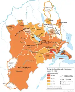 Území kantonu Lucern rozšiřovala kantonální metropole dobýváním, či koupěmi, převážně v letech 1380–1424. K těmto připojeným územím patřilo panství Wolhusen, hrabství Willisau, jižní část hrabství Lenzburg a různá další menší území, přičemž jako první bylo získáno, roku 1380, město Weggis. V roce 1332 se stal členem Švýcarské konfederace, jakožto její čtvrtý člen. V letech 1394–1802 měl kanton navíc ještě jednu exklávu Merenschwand, tvořenou obcemi Merenschwand (včetně území bývalé obce Berzenschwill) a Mühlau, která se pak stala součástí nového kantonu Aargau výměnou za Amt Hitzkirch.