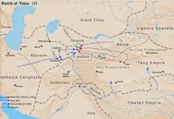 Mezitím, pod dojmem z Kao Sien-č’ova útoku na Šáš, různé státy v regionu odpadly od Tchangů a přešly k Abbásovskému chalífátu. Kao reagoval shromážděním 30tisícové armády a tažením proti nim. V údolí řeky Talas se střetl s abbásovským vojskem vedeným guvernérem Samarkandu Zijád ibn Sálihem, boje trvaly pět dní, rozhodl je přechod Karluků na stranu Abbásovců.[6] Tchangské síly byly rozdrceny, zachránilo se pouze několik tisíc vojáků. Neúspěch v bitvě u řeky Talas položil konec tchangskému postupu na západ, nicméně i Abbásovci utrpěli těžké ztráty a zastavili expanzi na východ. Kao byl po bitvě přeložen do Čchang-anu na místo generála císařské gardy, novým ťie-tu-š’ An-si se stal Wang Čeng-ťien. Roku 755 Kao obdržel titul vévody z Mi-jün.