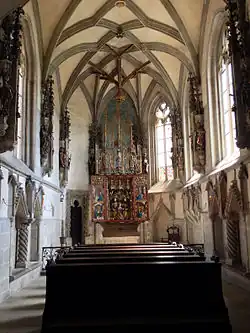 V kapli se nachází celkem sedm 30 centimetrů hlubokých výklenků, pět širších a jeden užší. Uprostřed výklenků se nacházejí sloupky, stojící na čtyřboké desce a rovněž čtyřboké patce. Dříky jsou šroubovitě obtočeny oblouny. Hlavice jsou zdobené listy. Nad sloupky stojí fiály, které nejsou ukončeny, ale zarážejí se do pásové římsy. Mezi fiálami jsou výklenky střechovitě ukončeny krycími římsami, které jsou ozdobené kraby. V kněžišti se dále nachází jeden trojitý výklenek dva a půl metrů široký.