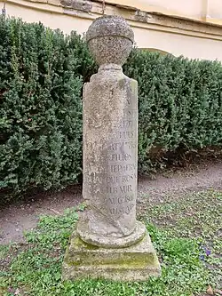Na jižní straně kaple se těsně u živého plotu nachází nenápadná památka sepulkrálního umění. Jedná se o náhrobek brněnského zlatníka Josefa Achbauera, narozeného (17.) února 1717 a zemřelého 21. března 1788.[8] Zlatník Achbauer je zmíněn v souvislosti s odhadem předmětů moravských klášterů zrušených reformami Josefa II. na konci 19. století.[9] Náhrobek z dnes již značně zvětralého (vápence) má podobu štíhlého sloupu zakončeného vázou. Na přední straně je částečně opadaný latinsky psaný nápis s datem narození, úmrtí, a dozvídáme se, že při skonu byli přítomni děti Jan Nepomuk a dcera Róza, a že byl pravděpodobně přepohřben 6. srpna 1808. Strana obrácená k živému plotu obsahuje (díky nepřístupné poloze) nečitelný text. Umístění náhrobku není původní. Pochází pravděpodobně ze zaniklého městského hřbitova na dnešní Kounicově ulici.[10]