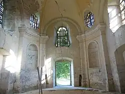 Vnitřek je sklenut kupolí, v presbytáři je valená klenba s lunetami.[3]