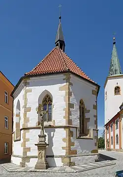 - ↑ „Letha 1484 gest tato czeska kapla / wistawena gest szase obnowena 1580 / ktomu kameni kůru i ka / zatelnicze szdelati dali“