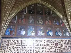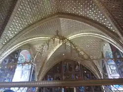 - ↑ Ty mají symbolický charakter. Názvy kamenů odpovídají devíti andělským kůrům, které sídlí v nebi. Byly to: sardonix, topaz, jaspis, chryzolit, onyx, beryl, karneol a smaragd. Drahokamy vyskládanými do tvaru kříže se obložily i spodní pásma zdí pod obrazy. Tento pás měl představovat hradby města Jeruzaléma.