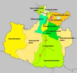 Karačajsko-Čerkesko se člení na 2 městské okruhy a 10 rajónů. Není jasné, zda všechny subjekty užívají vlastní vlajku.