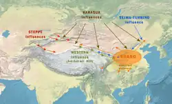 Sejma-turbinská kultura expandovala na západ a v období 2200 až 1700 př. n. l. se setkala s abaševskou kulturou a kulturou Sintašta. Naopak expanze karasukské metalurgie směřovala na východ. Jejich styl byl kopírován po celé střední a východní Asii a dostal se i do Číny, kde byly objeveny četné bronzové předměty vyrobené podle karasukského vzoru. Zejména královské pohřebiště v Jin-sü, které je zapsáno i na seznam světového dědictví UNESCO, datované do období 13. až 11. století př. n. l., tedy do období dynastie Šang, je známé četnými nálezy těchto karasukských napodobenin.[14]