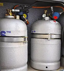 V plynových rozvodech karavanů se používá směs propan butanu (LPG), pro napájení vařičů, topení, napájení plynových lednic, nebo i pro napájení plynových bojlerů pro ohřev teplé vody. Plynové rozvody jsou napojené na vnitřní vyměnitelné plynové láhve, nebo na vnitřní pevně zabudované plynové láhve se systémem pro externí plnění, stejným jako pro plnění plynových nádrží, nebo mohou být napojené na pevnou vestavěnou plynovou nádrž.