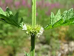 Drobné bílé, nachově tečkované, nevonné květy v hustých lichopřeslenech spočívají v úžlabích vstřícných listů. Květenství obsahují po 20 až 60 nahloučených květech, jejich méně členěné listeny se tvarem podobají listům a listence jsou úzce kopinaté. Kalich s pěti cípy je srostlý, neopadavý, nálevkovitý, 3 mm dlouhý a do větší poloviny členěný, tři jeho cípy s třemi žilkami jsou delší (3 mm) a dva se dvěma žilkami jsou kratší (2 mm). Bílá, srostlá, trubkovitá koruna s červenými skvrnkami je čtyřlaločná, asi 4 mm dlouhá, horní pysk je celistvý a tří laloky spodního pysku jsou shodně velké; koruna není zřetelně dvoupyská, ale téměř pravidelně čtyřcípá. V květu jsou dvě tyčinky s prašníky a čnělka s bliznou, podsemeníkový žláznatý val s nektarem je čtyřlaločný. Květ je protandrický, v prvé etapě po rozvití květů přesahují ven z koruny zralé prašníky a teprve když se vypýlí a uvadnou, tak dospějí vajíčka v semeníku, čnělka povyroste, blizna dospěje a přečnívá lístky koruny. Květy rozkvétají postupně, jen málo jich kvete současně, opylovány jsou včelami, mouchami i vosami.