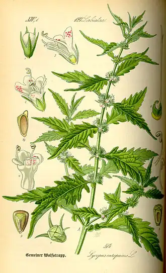 - ↑ US National Plant Germplasm System: Lycopus europaeus [online]. United States Department of Agriculture, Beltsville, MD, USA [cit. 2018-04-23]. Dostupné online. (anglicky)