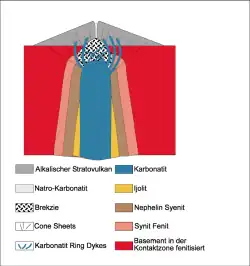 Karbonatitový vulkanismus je všobecně spojen s vnitrodeskovými extenzními strukturami, většinou v blízkosti ultrabazických nebo alkalických komplexů[3] v asociaci s alkalickými silikátovými magmatity (ijolity, urtity, nefelinickými syenity, méně s pyroxenity, peridotity, kimberlity a lamprofyry).