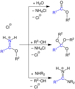 Karboximidáty jsou dobrými elektrofily a účastní se řady adičních reakcí; alifatické obecně reagují rychleji než aromatické imidáty.[1] Mohou být hydrolyzovány na estery a obdobnými reakcemi s aminy nebo amoniakem vytvářet amidiny. Alifatické imidáty reagují v kyselém prostředí s alkoholy za vzniku orthoesterů (RC(OR)3), aromatické se takovýchto reakcí mohou účastnit také, ovšem reagují výrazně pomaleji.