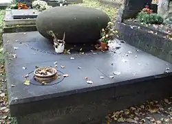 Hrob Karla Plicky na Národním hřbitově ve slovenském Martině. Oválný kámen znázorňuje čočku fotoaparátu.