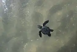 Po kontaktu s vodou začnou mláďata plavat směrem od břehu. Nádechy nad vodou, kdy plavou na čubičku, střídají s plaváním pod vodou, kdy prudce zabírá svými horními končetinami. Pod vlnami se potápí. V první fází plavání se mláďata orientují podle pohybu vln a orbitálního pohybu vody, který dovedou vycítit. To jim umožní překonat vlny u pobřeží, které mohou být kontra-intuitivní: želvičky se vrhají proti vlnám, i když je snazší se jimi nechat unášet zpět na břeh. Jakmile překonají bariéru vln u pobřeží, pokračují s plaváním a začínají se orientovat patrně podle vnitřního magnetického kompasu (podobně jako je tomu u navigace ptáků). Takto plavou 20–30 hodin, než dojde k nabrání mláďat mořskými proudy, které je zanesou do pelagických zón, kde stráví příštích několik let.[16]
