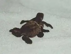 Po vylíhnutí váží obvykle mladé želvy méně než 22 gramů, mají tmavě hnědé až černé zbarvení a jejich krunýř dosahuje na délku zhruba 2,5 cm. Instinktivně se hned po vylíhnutí snaží dostat co nejrychleji do oceánu, kam je vede odraz měsíce ve vodě (často si tento jev karety pletou s nepřirozenými světelnými zdroji, jako např. lampami nebo veřejným osvětlením). Želvy, které se do oceánu nedostanou do úsvitu se stávají kořistí dravců (hlavně bahňáků a racků) nebo nejrůznějších druhů větších krabů.