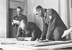 Konference německých velitelů na východní frontě. Nad mapou se naklání maršál Erich von Manstein, vedle něj generál Karl Adolf Hollidt.