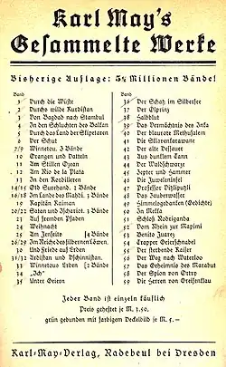 Seznam je vypracován podle přehledu na stránkách Karl-May-Wiki[5] a dle seznamu uvedeném na stránkách nakladatelství Karl-May-Verlag[6]
