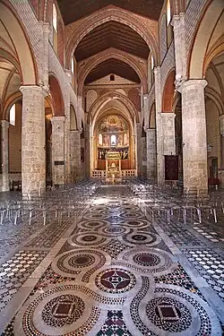 Interiér má tři lodě s hodnotnou mozaikovou podlahou vyrobenou v roce 1231 slavnou kamenickou rodinou Cosmatiů z římského mramoru. Luneta nad centrálními dveřmi zobrazuje Madonu s dítětem mezi sv. Magnusem a sv. Secondinou (pozdní 13. století). V pozadí centrální apsidy jsou vidět postavy apoštolů, každý se svým vlastním atributem, kteří jsou burgundskou prací z 17. století, nad postavami svatých uctívaných v Anagni, Obrazy Zvěstování a Věčného Otce vytvořili malíři Pietro a Giovanni Gagliardi. V levé apsidě jsou obrazy Učedníci emauzští a Klanění andělů, v pravé Sňatek mezi svatým Josefem a Pannou Marií a Smrt svatého Josefa. V hlavní apsidě dále jsou tři vzácná díla od Vassalletta (1263): nádherný mozaikový kroucený sloup pro paškální svíci, biskupské křeslo a ciborium nad oltářem; všechna tato díla byla zadána biskupem Landonem. Dále zde je křtitelnice a kaple Lauriů, Caetaniů a Raoliů (také známá jako kaple sv. Karla) s obrazem Madony Milosrdné od Frenguelliho darovaným papežem Lvem XIII, a po stranách také dva obrazy od bratří Gagliardiů.