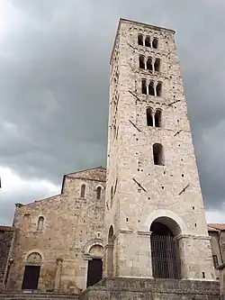 Průčelí vyjadřuje sílu a jednoduchost neomítnutou zdí, na které se otevírají tři vchody orientované na východ. Vedle levého vchodu je za mříží freska Madony trůnící mezi sv. Kateřinou a sv. Antonínem (14. století). Západní část sakrální budovy má tři krásné apsidy a schodiště, které dává celku slavnostní tón. Zvonice je 30 m vysoká v románském slohu a má jednoduchá, dvojitá i trojitá okna. Byla restaurována v roce 1938, kdy byla zpevněna železem, a je na ní pět zvonů.