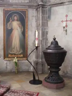 Románsko – gotická křtitelnice ze 14. století je nejstarší památkou zachovanou v chrámu. Pochází ještě ze starého kostela svaté Alžběty, předchůdce dnešního chrámu. Noha křtitelnice je dekorovaná trojúhelníky, kalich zdobí zoomorfní reliéf s lvy, gryfy a orly. Horní okraje je lemován dnes již nečitelným latinským nápisem. Vrchník je z roku 1914.