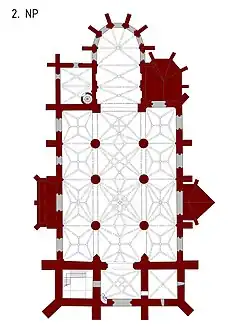 Půdorys s vyobrazenými klenbami chrámových lodí, presbytáře a depozitáře
