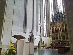 presbytář s novogotickým oltářem podle návrhu Josefa Mockera