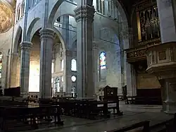 Trojlodní chrám má dvoulodní transept. Empory lodi nejsou osvětleny.
