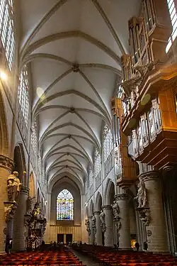 Hlavní loď katedrály má všechny vlastnosti brabantské gotiky: čtyřdílné klenby jsou středně vysoké a robustní válcovité sloupy, které lemují střední uličku hlavní lodi, jsou zakončeny hlavicemi v podobě zelných listů. Na sloupech jsou připevněny sochy 12 apoštolů. Tyto sochy pocházejí ze 17. století a vytvořili je Lucas Faydherbe, Jerôme Duquesnoy mladší, Johannes van Mildert a Tobias de Lelis, všichni známí sochaři své doby. Tyto sochy nahradily sochy zničené ikonoklasty v roce 1566. V lodi je také barokní kazatelna ze 17. století, kterou vytvořil antverpský sochař Hendrik Frans Verbruggen v roce 1699. Základna představuje Adama a Evu vyhnaného z rajské zahrady po utrhnutí zakázaného ovoce. Nahoře Panna a dítě, které hada probodly, symbolizují vykoupení.