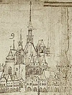 Pozdně gotická podoba s hodinovou věží a zvonicí v pozadí