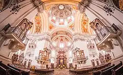 Dne 25. září 1628, uprostřed válečné vřavy třicetileté války, byl chrám slavnostně vysvěcen arcibiskupem Paridem Lodronem. Slavnost vysvěcení chrámu byla největší a nejmonumentálnější, jakou kdy Salcburk zažil. V 50. letech 17. st. bylo dokončeno i západní průčelí stavbou nárožních věží. V roce 1944 byla při jednom z náletů na Salcburk, který byl baštou nacismu, zničena kupole chrámu a část oltáře. Po několika letech stavebních prací byl chrám obnoven ve své bývalé kráse a v roce 1959 nově vysvěcen.