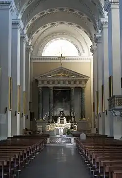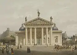 Portikus katedrálního chrámu je rovněž postaven v dórském stylu. V jeho vrchní části se nachází figurální kompozice italského sochaře Riggia, která vyobrazuje Noeho oběť Hospodinovi. Fasádu dotvářejí dvě sochy Abrahama a Mojžíše, umístěné po stranách průčelí chrámu. Vnitřek zvelebily čtyři menší sochy evangelistů s jejich symboly – Marka s andělem, Matouše se lvem, Lukáše s beránkem a Jana s orlem. Dříve se v těchto místech (nad dveřmi) nacházely výjevy ze života apoštolů. Nad frontonem se nacházejí tři monumentální sochy: sv. Eleny s velkým pozlaceným křížem uprostřed, vlevo sv. Stanislava a vpravo sv. Kazimíra. Tyto sochy jsou díly litevských mistrů Karolise a Kazimíra Elskisových, kteří je vytvořili podle návrhu mistra Smuglevičiuse a podle rozměrů L. Gucevičiuse. Chrám se v takové podobě zachoval dodnes.