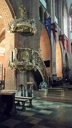 Součástí interiéru je i gotická křtitelnice z 15. století, vyrobená z tepaného měděného plechu a socha biskupa Marcina Dunina (zemřel 1842) od Andrzeje Friedericha, pocházejícího ze Štrasburku, z roku 1846.