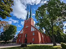 Jedná se o halový kostel z cihel a kvádříkového zdiva, který je nápadný červenou fasádou a dvojicí štíhlých věží, vysokých 63 metrů. Vitráže, oltář a kazatelnu vytvořil švédský výtvarník českého původu Jan Brázda.[3] Koberec na oltáři navrhla Märta Måås-Fjetterström, autorem moderní křtitelnice je Göran Wärff. Zvony odlila Bergholtz klockgjuteri ze Sigtuny. Nacházejí se zde troje varhany, největší z nich vytvořil roku 1774 Lars Wahlberg a v roce 2002 je rekonstruovaly společně firmy Grönlunds Orgelbyggeri, Ålems Orgelverkstad a Bergenblad & Jonsson Orgelbyggeri.