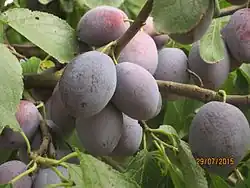 Plod podlouhlý, malý až střední velikosti. Slupka modrofialová, ojíněná. Dužnina je zelenožlutá, chutná, obvykle jde dobře od pecky. [4]