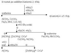 Filtrát po vysrážení kationtů II. třídy povaříme na vodní lázni. Přidáme asi 0.5 ml nasyceného roztoku NH4Cl a zneutralizujeme NH4OH (1:1). Potom se do směsi po několik minut zavádí sulfan (sulfan lze ve všech třídách vyměnit za Na2S). Sraženina se odfiltruje a roztok se uchová pro důkazy kationtů IV. a V. třídy. Sraženina sulfidů a hydroxidů se dvakrát promyje 0,5 ml NH4OH a rozpustí se v co nejmenším množství HCl (1:1) za varu. Je-li přítomen nikl a kobalt (sraženina sulfidů byla černá a nerozpouští se v HCl), musí se rozpouštění podpořit přidáním bromové vody a intenzivním mícháním. Do vzniklého čirého roztoku se přidá 25% NaOH do zřetelně alkalické reakce a malé množství tuhého Na2O2 (lze zaměnit za kapalný H2O2) a opatrným povařením se rozloží nadbytek peroxidu (až ustane šumění). Vzniklá sraženina se odfiltruje a analyzuje se na přítomnost železa, manganu, kobaltu a niklu. Ve filtrátu se dokazuje hliník, zinek a chrom.