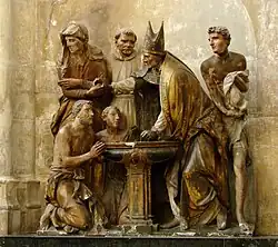 Většina germánských kmenů, které v následujících staletích napadly Římskou říši, přijala křesťanství v jeho ariánské podobě, kterou katolická církev prohlásila za heretickou.[68] Následným náboženským neshodám mezi germánskými vládci a katolickými poddanými[69] se podařilo zabránit, když roku 497 přestoupil franský vládce Chlodvík I. na ortodoxní katolicismus a spojil se s papežstvím a kláštery.[70] Jeho příkladu následovali roku 589 Vizigóti ve Španělsku[71] a v průběhu 7. století Lombarďané v Itálii.[72]