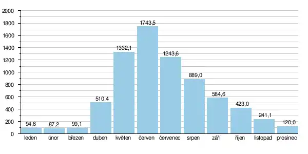 Průměrné měsíční průtoky řeky ve stanici Srostki v letech 1936 až 2000:[2]