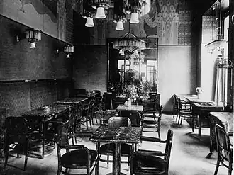 Veřejná část prostor kavárny byla členěna do tří: hlavní kavárenská místnost, kulečníková místnost a čítárna.[1] Centrální místnost kavárny byla členěna kójemi a dominoval jí velký kulatý dřevěný stůl.[3] Na hlavní místnost navazoval oddíl s biliárem a samostatná čítárna s velkým množstvím cizojazyčných i domácích, především uměleckých, periodik a připomínala poněkud studovnu.[3]