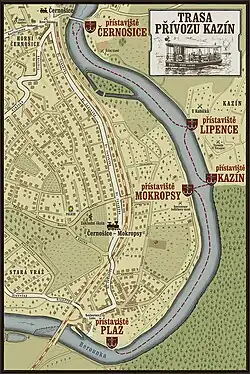 11. května 1925 udělila zemská správa povolení ke zřízení osobního loďkového přívozu u lázní „Kazín", později i u lázní „Pod hrádkem" – oba tyto nové přívozy podle obecní kroniky odebraly část přepravní frekvence dosavadnímu černošickému přívozu.[5] Historický provoz poprvé doložen 1899, naposledy 1950.[6]
