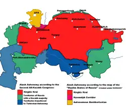 Po pádu carské vlády vznikl nakrátko na území Kazachstánu státní útvar zvaný Alašská autonomie kontrolovaný bělogvardějci, s hlavním městem Semejem.[47] Území Kazachstánu se však už v roce 1919 dostalo pod kontrolu bolševiků. Poté přes 300 000 Kazachů odešlo přes hory do sousední Číny. 26. srpna 1920 byla zřízena Kyrgyzská autonomní sovětská socialistická republika (Rusové tehdy Kazachům říkali jaksi obecně „Kyrgyzové“), s hlavním městem Orenburgem, kde žili především etničtí Rusové. Byla součástí Ruské SFSR. V červnu 1925 byla republika přejmenována na Kazašskou a její správní centrum bylo přemístěno do města Kyzylorda. V dubnu 1927 se pak hlavním městem stala Alma-Ata (dnešní Almaty).
