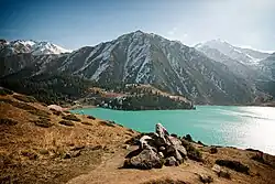 Kazachstán,[pozn. 3] plným názvem Republika Kazachstán,[pozn. 4] je vnitrozemský stát především ve střední Asii, s malou částí ve východní Evropě.[8][9] Na západě a na severu sousedí s Ruskem, na východě s Čínou, na jihovýchodě s Kyrgyzstánem, na jihu s Uzbekistánem a na jihozápadě s Turkmenistánem, pobřeží se táhne podél Kaspického moře. Rovinatá step zaujímá třetinu země, další třetinu nížiny, na jihu a východě se nacházejí pohoří, nejvyšší velehory jsou na jihovýchodě země. Podnebí se mění od studeného vlhkého kontinentálního na severu přes studené semiaridní ve střední části až po studené aridní na jihu. Kazachstán se dělí na 17 oblastí, na ploše 2,7 mil km2 žije 20 milionů obyvatel. Je devátou největší zemí světa podle rozlohy a největší vnitrozemskou zemí, má jednu z nejnižších hustot zalidnění.[10] Hlavním městem je Astana, největším městem a hlavním kulturním a obchodním centrem je Almaty, dalšími velkými městy jsou Šymkent, Aktobe a Karaganda. Kazaši tvoří přes 70 % obyvatel, největšími menšinami jsou Rusové a Uzbeci, oficiálními jazyky jsou kazaština a ruština, kolem 70 % obyvatel se hlásí k islámu.