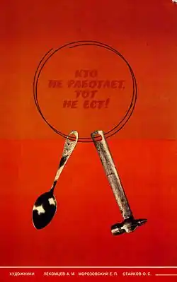 Pozměněnou zásadu, která zní: „Kdo nepracuje, ať nejí!“ (rusky Кто не работает, тот не ест, Kto ně rabotajet, tot ně jest), použil Vladimir Iljič Lenin v roce 1917 ve svém díle Stát a revoluce.[4] V květnu 1918 byl v Pravdě publikován Leninův článek o hladomoru v Petrohradě,[5] kde se upravené biblické úsloví rovněž nacházelo a později se stalo komunistickým heslem, vztahujícím se k fenoménu sociálního parazitismu a příživnictví.[6] Když Lev Davidovič Trockij ve svém díle „Zrazená revoluce“ kritizoval Stalina, tak řekl, že během velkých čistek v letech 1936–1937 bylo toto heslo nahrazeno větou: „Kdo neposlouchá, ať nejí!“.[7]