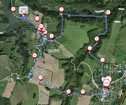 Začíná v Nasavrkách před zámkem, vede na sever podél přírodní památky Kaštanka, která se zde nachází už od roku 1776. Následně cesta pokračuje do Strádovského pekla. Dále prochází přírodní rezervací Krkanka do obce Hradiště. Nejzajímavější součástí stezky je prostor bývalého oppida, ve kterém je umístěn malý okruh se 6 naučnými tabulemi. Ty jsou zaměřeny na archeologický výzkum, který zde probíhal. Trasa pokračuje na jih do vesnice České Lhotice a odtud kolem rozhledny Boiika, ze které je nádherný výhled na Orlické hory, zpět do Nasavrk.