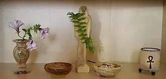Domácí kemetistický oltář boha Thovta; ověnčení sochy na způsob šerpy odkazuje na starověké mytologické pojetí Thovta jako písaře bohů a pána posvátných rituálů, zelená barva byla jeho tradiční barvou