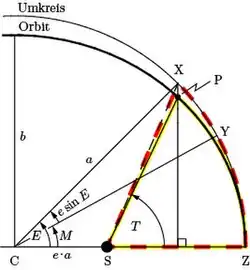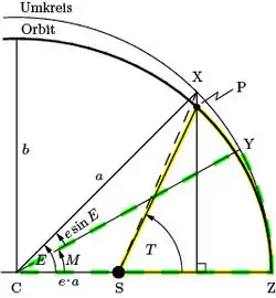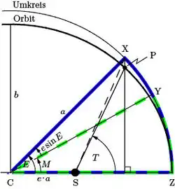 Projekcí pozice planety na kružnici opsanou eliptické oběžné dráze ve směru kolmém na hlavní poloosu je pomocný bod . Úhel s vrcholem ve středu kružnice a rameny tvořenými periapsidou a polopřímkou vedenou ze středu bodem , Kepler nazval excentrická anomálie . Z podobnosti plyne následující vztah: