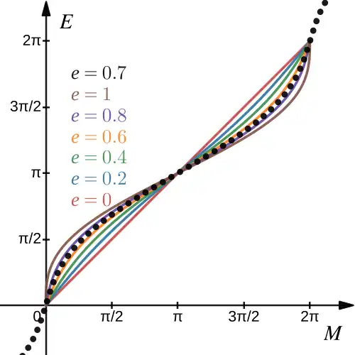 Keplerova rovnice popisuje vztah mezi polohou nebeského objektu vůči hmotnému středu v jednom z ohnisek elipsy udanou ve formě pomocné veličiny excentrické anomálie , a času zadaného pomocí střední anomálie . Parametr je numerická excentricita eliptické oběžné dráhy.