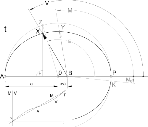 Rovnoměrné plynutí času lze vyjádřit pohybem fiktivní tělesa (na obrázku ) po kruhové dráze s konstantní úhlovou rychlostí. K tomuto účelu se používá „kružnice opsaná“ kolem keplerovské elipsy, po které obíhá . je okamžik, kdy se jak bod tak skutečný objekt nachází v periapsidě . Oba body mají tutéž oběžnou dobu a oba současně procházejí při každém celočíselném násobku oběžné doby periapsidou a při každém polovičním násobku apoapsidou.
