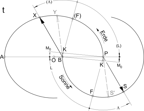 - ↑ Dieser Zusammenhang erlaubt umgekehrt, die ekliptikale Länge und den Jarní bod F als Bezugspunkt (sowohl für als auch für ) auf die Erdbahn zurückzuspiegeln (siehe nebenstehende Abbildung, rechts → links).