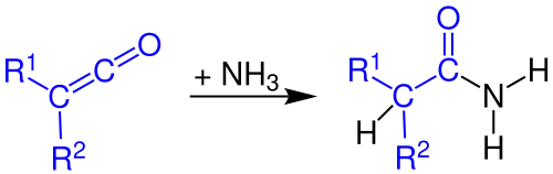 Keteny reagují s amoniakem za vzniku primárních amidů: